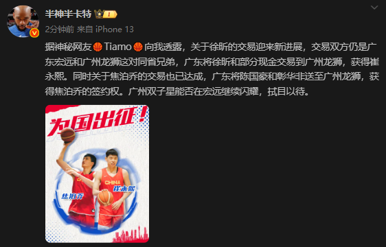 雷速体育8月28日讯 今日,据国内体育媒体人@半神半卡特爆料:广东男篮送出陈国豪等四人+大量现金,换回崔永熙+焦泊乔。